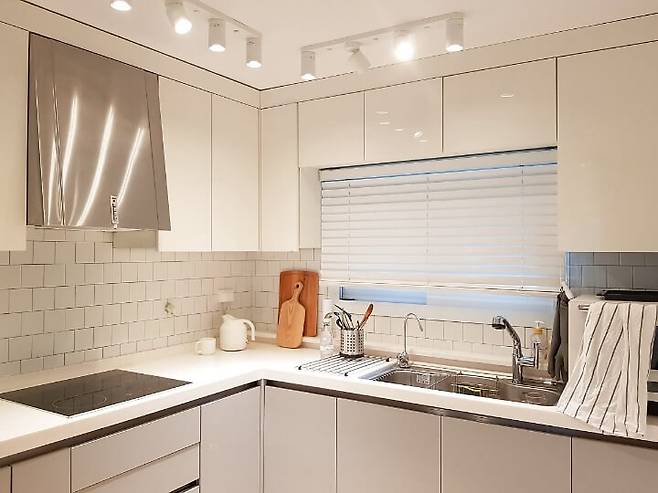 요즘 유행하는 상부장 없는 주방이 눈에 아른거렸지만 수납적인 부분과 비용 문제로 포기했어요. 하지만 비용 대비 예쁘고 깔끔해진 주방이 무척 마음에 들어요.