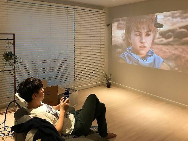 블라인드 : 창안애 원목 우드 블라인드 롤스크린 / 거울 : 오투가구 피카 행거 전신거울 / 빔프로젝터 : 옵토마 SUHD60