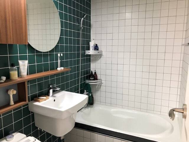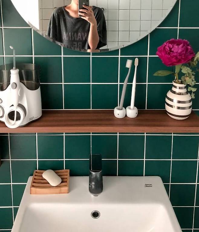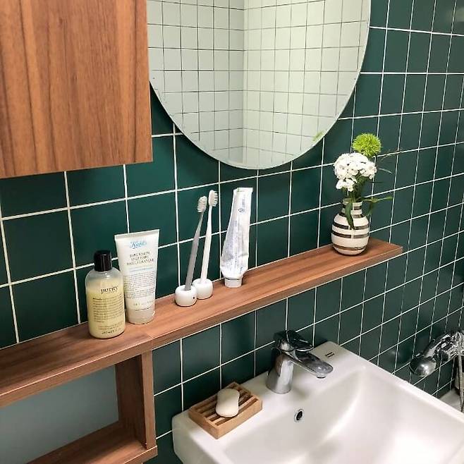 앞서 보여드린 화장실은 핑크색으로 여성스럽게 꾸몄다면, 이 화장실은 청록색 타일과 우드의 조합으로 스타일리시하게 꾸몄어요.