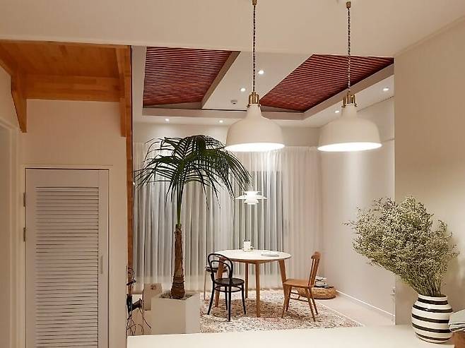 처음 집을 보러 왔을 때 전체적인 분위기가 촌스럽다고 생각했어요. 철거를 하려다가 비용 문제로 인하여 그냥 사용하기로 했는데, 조명을 설치하고 나니 오히려 빈티지하고 따뜻한 느낌이 나는 공간으로 바뀌었어요.