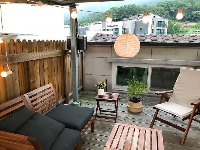 야외섹션 : 이케아 APPLARO 에플라뢰 1인용야외섹션 / 리클라이너 : 이케아 APPLARO 에플라뢰 야외리클라이너 / 스툴 : 이케아 APPLARO 에플라뢰 야외스툴 / 조명 : 이케아 STRALA 스트롤라 LED체인조명12등