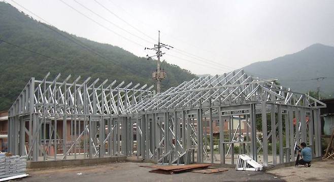 냉간 성형강_열을 가하지 않고 상온에서 성형된 강재를 의미하며, 스틸하우스에 사용되는 자재는 아연 도금 강판을 롤 포밍기로 냉간 성형해 제작한다.