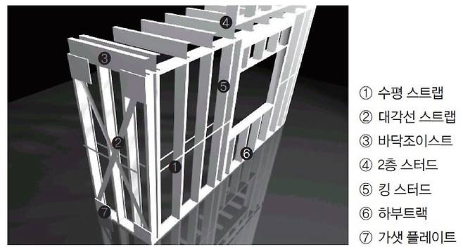 스틸하우스는 스틸 스터드 Stud라고 하는 두께 1㎜ 내외의 아연 도금된 냉간 성형강 구조용 자재로 주택의 뼈대를 구성하는 공법이다.