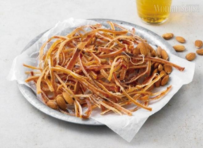 입은 심심한데 무거운 음식은 먹기 싫을 때, 예능 프로그램을 보며 맥주 한잔을 하고 싶을 때 생각난다. 천일염, 설탕, 석류 과즙 농축액 등으로 조미해 달짝지근하면서도 짭짤한 맛이 특징이다. 슬라이스된 오징어를 하나 집어 먹기 시작하면 나도 모르게 중독돼 계속 집어 먹게 된다. 별도 조리 없이 그냥 먹어도 되지만 전자레인지에 살짝 구우면 더욱 고소해진다. 건어물 특유의 딱딱함이 있는 오리지널과 부드러운 소프트로 종류가 나뉘어 있다.