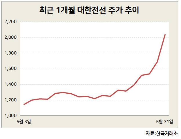 반면 대한전선 주가는 폭등세를 기록했다. 이달 중순까지만해도 1200원선에 머물던 주가는 최근 5거래일 연속 상승하며 2000원을 돌파했다. 연초 1조1862억원이던 시가총액도 1조7429억원으로 불어나며 LS와의 격차를 5000억원으로 줄였다.