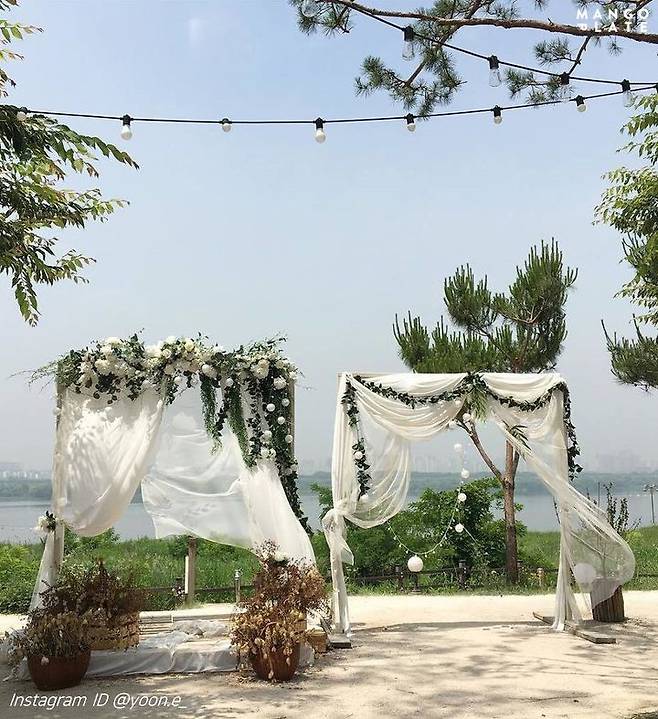 이글루 카페로 유명한 이곳. 여름을 맞아 하얀 천이 반겨주는 웨딩 콘셉트로 테마를 바꿨는데요. 하얀 원피스 입고 셀프 웨딩촬영하고 싶어 지는 배경. 인생 샷 플레이스라 불릴만하죠?