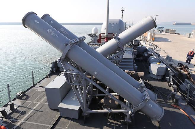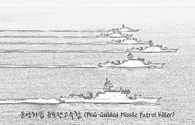 ‘검독수리-A 사업’으로 탄생한 윤영하급 유도탄고속함은 만재배수량 570톤에 전장 63m, 전폭 9m 규모다. 참수리급 고속정과 비교해 덩치는 커졌지만 최대 속력이 40노트(시속 74㎞)에 달하며 펀치력은 더욱 강력해졌다.