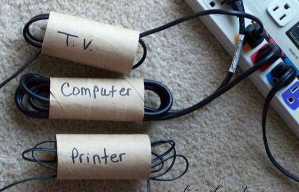 공기청정기나 가습기 등 가전제품을 사용하지 않을 때, 구불구불 길게 늘어진 전선은 보기 싫을 뿐 아니라 정리되지 않은 채 방치했다가 발이 걸려 넘어지기도 쉽다. 이럴 때 전선을 잘 말아서 휴지심 구멍에 쏙 넣어두면 간단하고 깔끔하게 정리할 수 있다. 각종 충전기 선, USB 케이블 등이 어지럽게 얽혀있다면 휴지심에 통과시켜 깔끔하게 정리해두고 네임 스티커를 붙여두면 사용하기에도 편리하다.