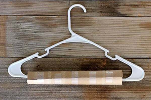 휴지심보다는 좀 더 긴 키친타월 심이 나올 경우 유용하게 활용할 수 있는 방법이다. 옷걸이 아랫부분에 바지나 니트를 걸어서 보관할 경우 자국이 남기 마련인데, 이곳에 키친타월 심을 잘라 끼워두고 그 위에 니트나 바지를 걸쳐두면 둥근 심 덕분에 옷걸이 자국이 남지 않도록 보관할 수 있게 된다. 일반 휴지심이라면 두세 개를 이어 붙여 사용하는 방법도 있다.
