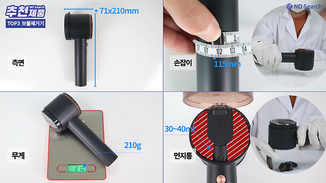 크기는 가로 71mm, 세로 210mm인데, 손잡이가 길게 빠져있으며, 둘레가 약 115mm로 얇아 보풀제거시 그립감이 매우 편리한 제품입니다.