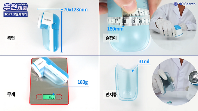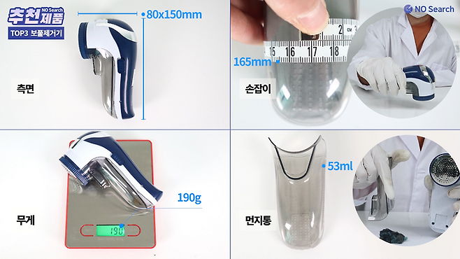 무게는 약 190g으로 보통정도 이며, 먼지통 용량이 53ml로 가정용 보풀제거기 중에서는 매우 큰 수준입니다.