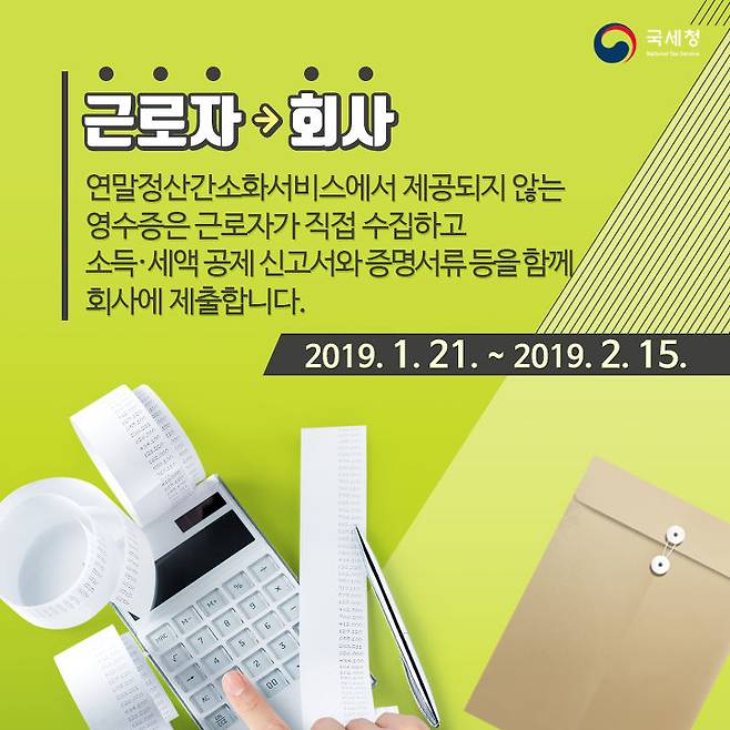 근로자는 회사로! 연말정산간소화서비스에서 제공되지 않는 영수증은 근로자가 직접 수집하고 소득·세액 공제 신고서와 증명서류 등을 함께 회사에 제출합니다.