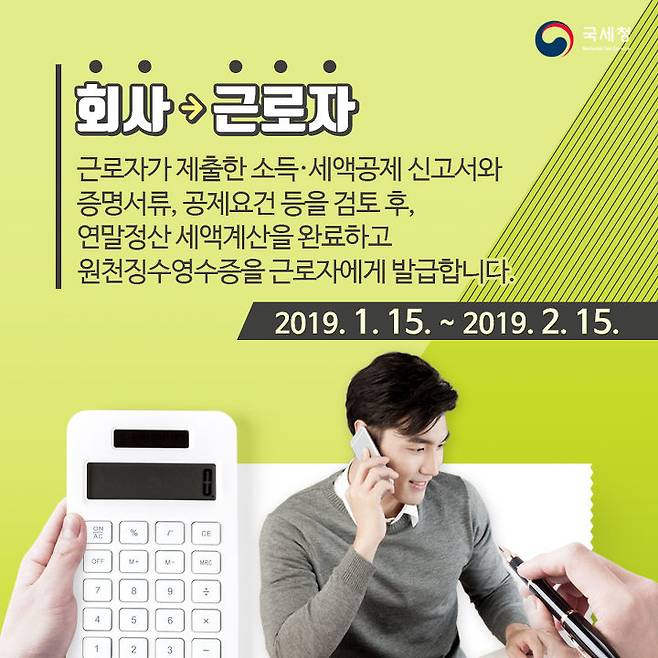 회사는 근로자에게! 근로자가 제출한 소득·세액공제 신고서와 증명서류, 공제요건 등을 검토 후, 연말정산 세액계산을 완료하고 원천징수영수증을 근로자에게 발급합니다.