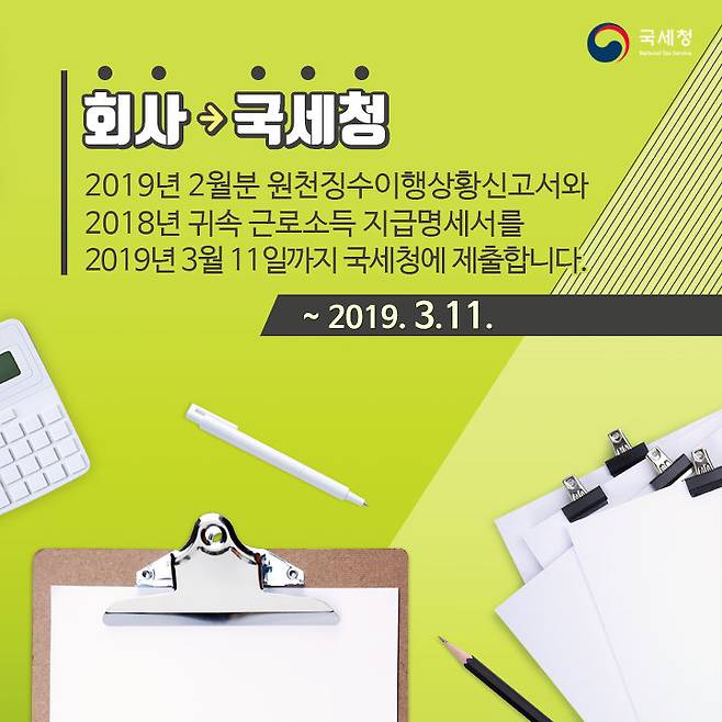 회사는 국세청으로! 2019년 2월분 원천징수이행상황신고서와 2018년 귀속 근로소득 지급명세서를 2019년 3월 11일까지 국세청에 제출합니다.
