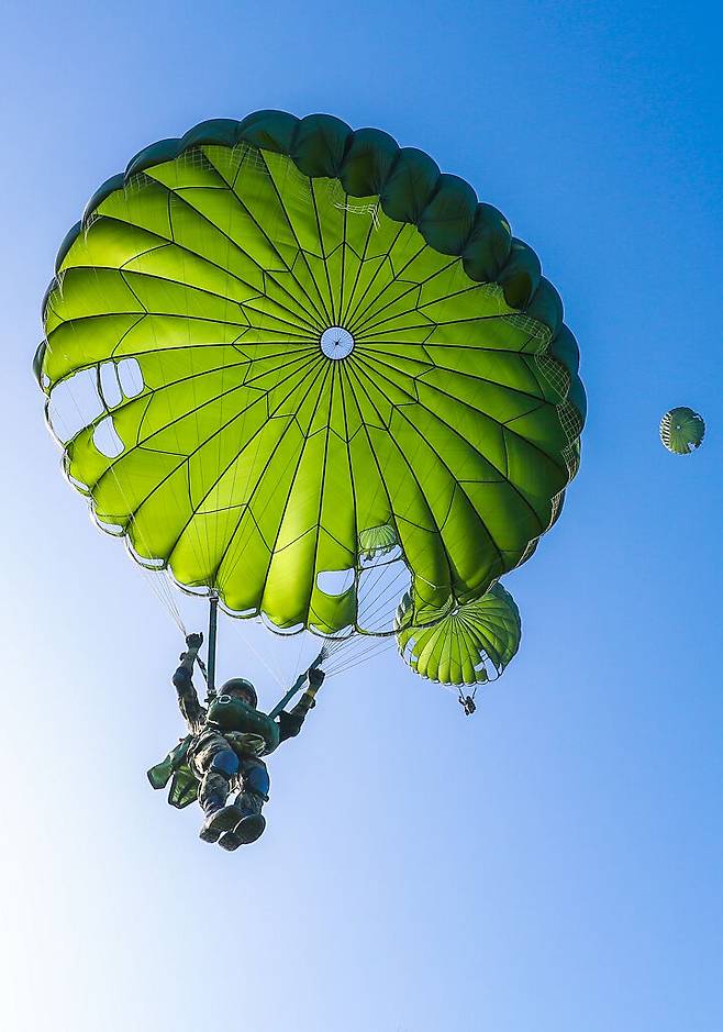 지난달 29일 육군특수전학교에서 ‘세계 최정예 대체불가’ 특전맨의 작별과 탄생을 알리는 뜻깊은 강하 훈련이 진행됐다. 전역을 앞둔 육군특수전사령부 김정우 주임원사와 836기 공수기본 교육생이 바로 그 주인공. 이들은 낙하산 하나에 의지한 채 과감히 창공에 몸을 날려 목표지점에 정확하게 착지하는 모습을 보여줬다. 그런데 이날 훈련에서 한 가지 눈길을 끄는 점이 있었다. 이들의 생명줄과 같았던 낙하산에 다름 아닌 ‘구멍’이 있었던 것. 공기구멍, 기공(氣孔)이라고 불리는 이 구멍은 왜 낙하산에 있는 걸까?