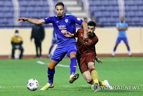 epa08999193 Al-Fateh's player Mitchell Te Vrede (L) in action against Al-Nassr's Ali Al-Oujami (R) during the Saudi Professional League soccer match between Al-Fateh and Al-Nassr at Prince Abdullah bin Jalawi Stadium, in Al-Hasa, Saudi Arabia, 09 February 2021. EPA/STR