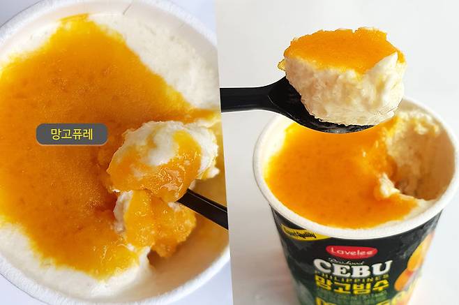 컵 망고빙수의 레전드라고 할 수 있어요. 망고 맛이 인위적이지 않고 달콤한 것이 정말 카페 맛에 뒤처지지 않아요. 게다가 망고퓨레가 위에서만 끝나는게 아니라 밑에까지 계속되어요. 그러니 이 빙수는 망고맛이 다했다고 할 수 있을 정도죠.