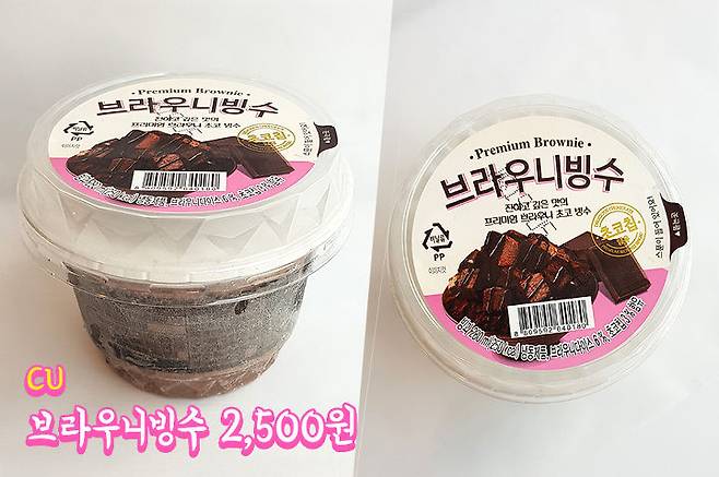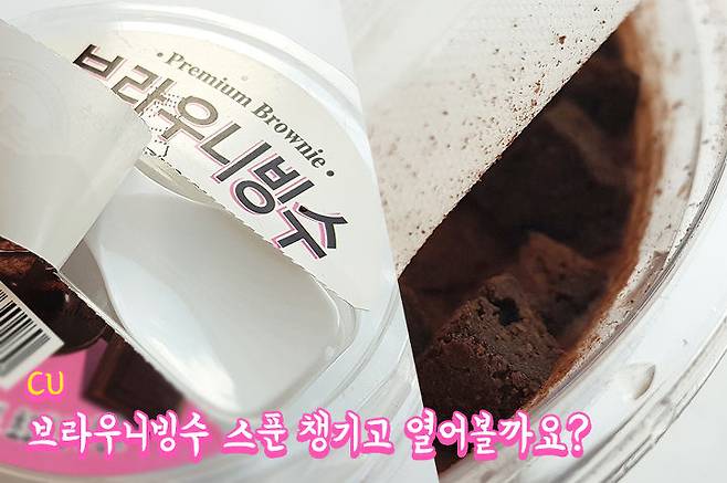 cu 브라우니 빙수는 세븐일레븐 빙수처럼 스푼을 뚜껑에 담고 있어요. 오픈을 하면, 브라우니인지 빙수인지 알 수 없을 만큼 크럼블이 윗면을 가득 채우고 있더라고요.