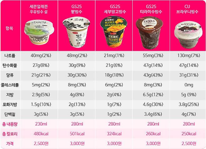 빙수 종류에 따라 영양성분에 차이가 있는데요. 그중에서도 눈에 띄는 것은 팥빙수의 칼로리에요. 달달한 단팥 때문이 아닐까 싶은데, 칼로리가 상당히 높아요. 이걸 보고 나니... 빙수를 후식이라고 할 수가 없겠어요.
