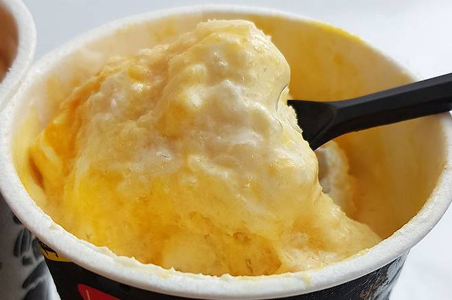 gs25의 빙수 중 요즘 가장 SNS에서 뜨거운 반응을 받고 있는 빙수가 이 녀석이에요. 그렇다면 망고 빙수의 속을 들여다볼까요? 달걀노른자를 연상케할 만큼 진한 노란 색상이 매력적이에요.