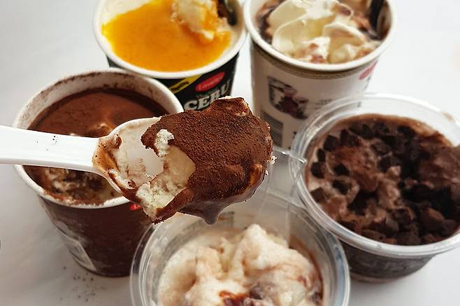 컵 가운데 들어있는 치즈 아이스크림은 요것만 따로 먹어도 맛있지만, 위를 덮고 있는 에스프레소 시럽과 컵 바닥의 커피 아이스와 잘 섞어 먹는 게 역시 꿀맛이에요. 더위 사냥 맛에 가까워지지만, 그것보다 더 맛있어요.
