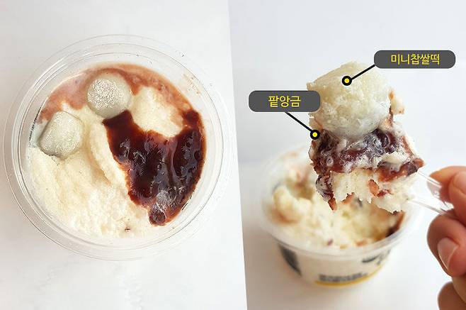 뚜껑을 딱 열어보니, 연유 맛이 진한 우유 얼음과 미니 찹쌀떡 2개, 팥앙금이 바로 보여요. 참고로 찹쌀떡은 보이는 게 다입니다. 그래도 스푼만큼 큼직한 찹쌀떡이라 만족스러워요.
