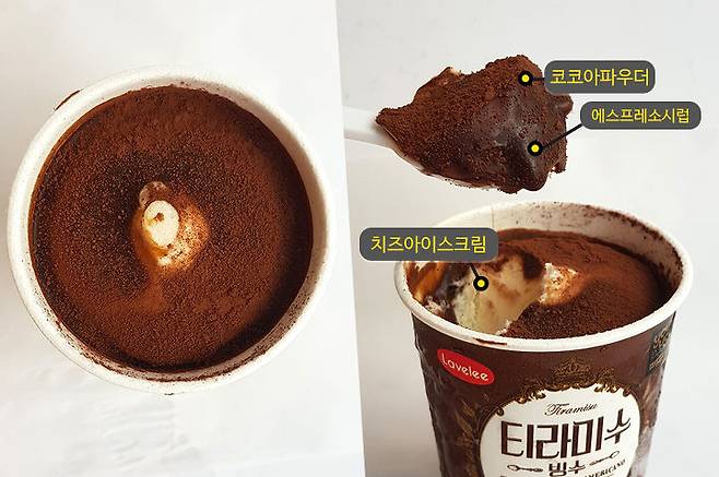위에서 보면 치즈 아이스크림이 가운데에 빼~꼼하고 모습을 드러내고 있는데요. 한 스푼 떠보니, 코코아 파우더 아래, 에스프레소 시럽 그리고 치즈 아이스크림이 가득 들어있더라고요. 맨 아래에는 커피 아이스가 있지만, 반은 먹어야 볼 수 있어요.
