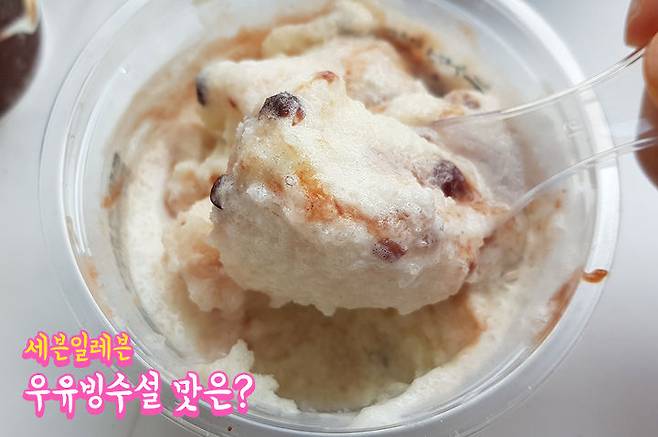 세븐일레븐의 빙수는 먹자마자, 추억으로 소환돼요. 예전에 가장 흔하게 먹던 팥과 연유 맛이 강한 빙수이기 때문인데요. 부드러운 우유 얼음과 함께 사각사각 씹히는 게 얼음들 이 어우러져 있어서 식감이 딱 익숙해요.