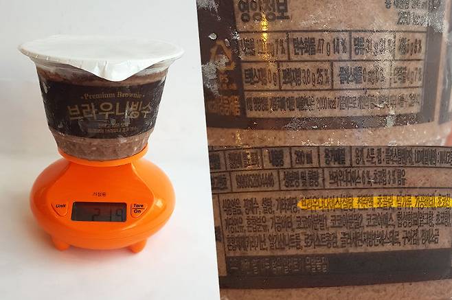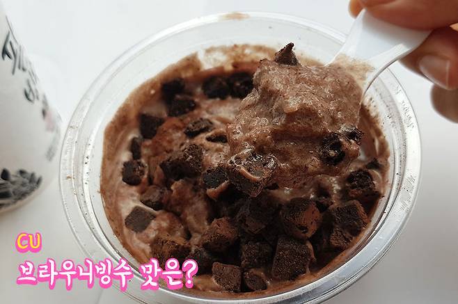 cu 브라우니 빙수는 세븐일레븐 빙수처럼 스푼을 뚜껑에 담고 있어요. 오픈을 하면, 브라우니인지 빙수인지 알 수 없을 만큼 크럼블이 윗면을 가득 채우고 있더라고요.