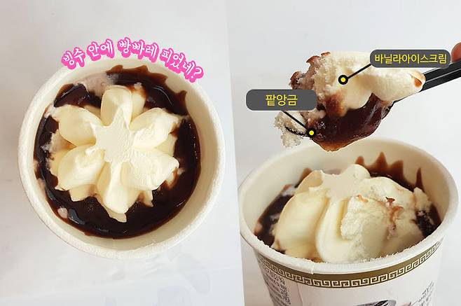 위에는 바닐라 아이스크림이 빵빠레처럼 올려져 있고, 그 주위로 팥 시럽이 뿌려져 있어요. 위에만 먹어도 맛있지만, 컵 밑에 살얼음이 숨어져 있어요.