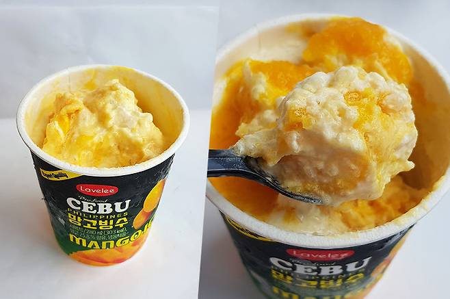 컵 망고빙수의 레전드라고 할 수 있어요. 망고 맛이 인위적이지 않고 달콤한 것이 정말 카페 맛에 뒤처지지 않아요. 게다가 망고퓨레가 위에서만 끝나는게 아니라 밑에까지 계속되어요. 그러니 이 빙수는 망고맛이 다했다고 할 수 있을 정도죠.