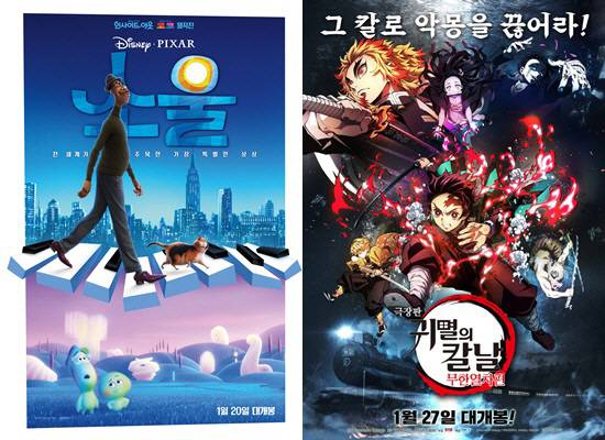 한주 차이로 개봉해 극장에서 맞대결을 펼치는 미국과 일본의 대표 애니메이션. 이는 최악으로 얼어붙은 연초 극장가를 따뜻하게 데워줬던 '소울'(닥터 피트 감독)과 '극장판 귀멸의 칼날: 무한열차 편'(이하 '귀멸의 칼날', 소토자키 하루오 감독)의 맞대결을 고스란히 떠오르게 한다.
