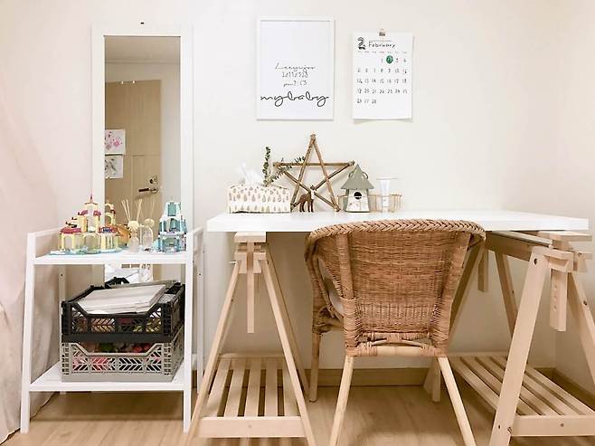 침대 옆 책상은 원래 서재에서 제가 사용하던 책상이었는데, 한글을 배우기 시작한 딸아이에게 필요할 것 같아 옮겨줬어요. 내년이면 초등학생이 되니 앞으로도 쭉 잘 사용할 것 같아요.