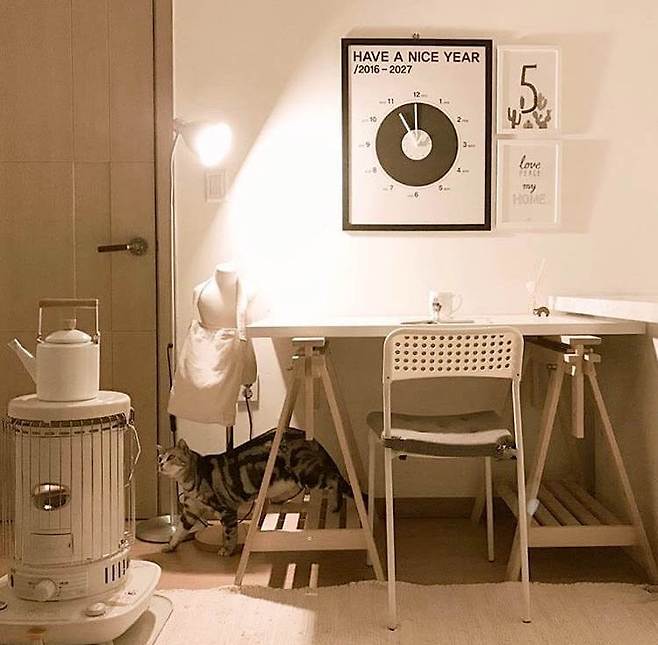 의자 : 이케아 ADDE / 주전자 : 니토리 범랑주전자 / 액자형 달력 : 쿨이너프스튜디오 HAVE A NICE YEAR_ FRAME 2017