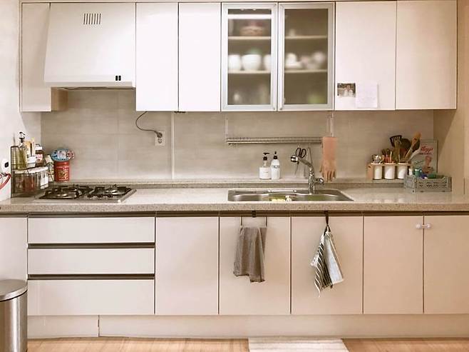 전업주부인 제게 주방은 거실 다음으로 가장 많이 머무는 곳이에요. 자주 사용하는 것들만 꺼내 두고 나머지는 전부 수납장 속으로 넣어두었어요. 필요할 때마다 꺼내 쓰며 최대한 깔끔한 상태를 유지하려 노력하고 있어요.