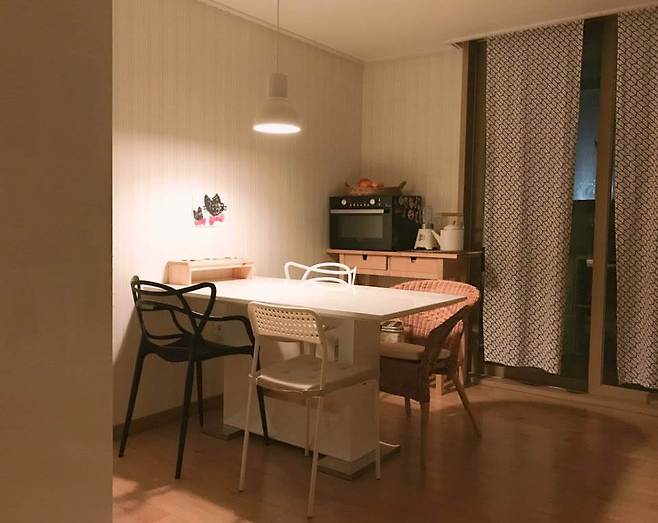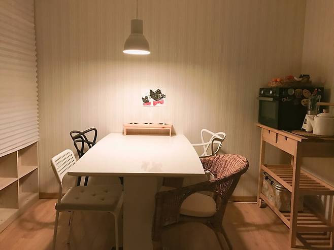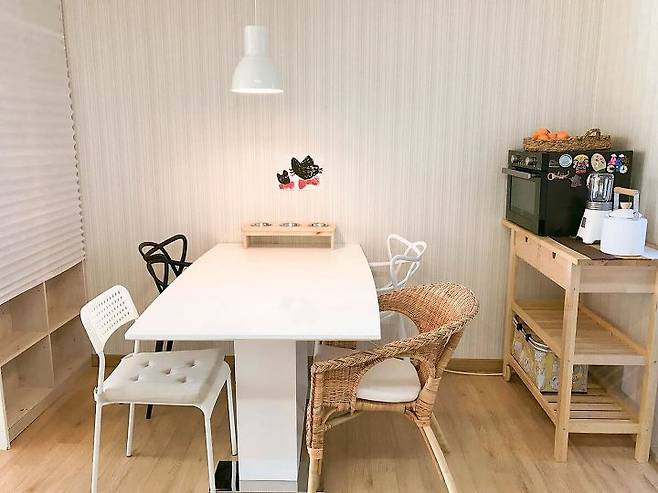 봄이 오면 새로 식탁을 구입할 계획이라 현재 식탁의자가 두개뿐이에요. 밥 먹을 땐 방에 있는 의자들을 하나씩 가져와서 사용하고 있답니다. ㅎㅎ