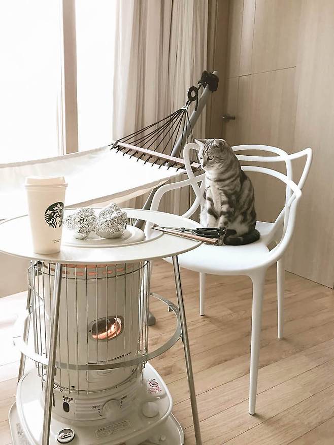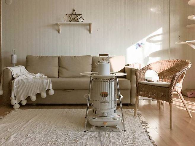 소파 : 이케아 FRIHETEN 3인용소파베드 / 블랭킷 : 데일리스푼 폼폼블랭킷 / 난로 : 코로나 난로 SL-66H / 캣타워 : 푸시캣 / 라탄의자 : AGEN