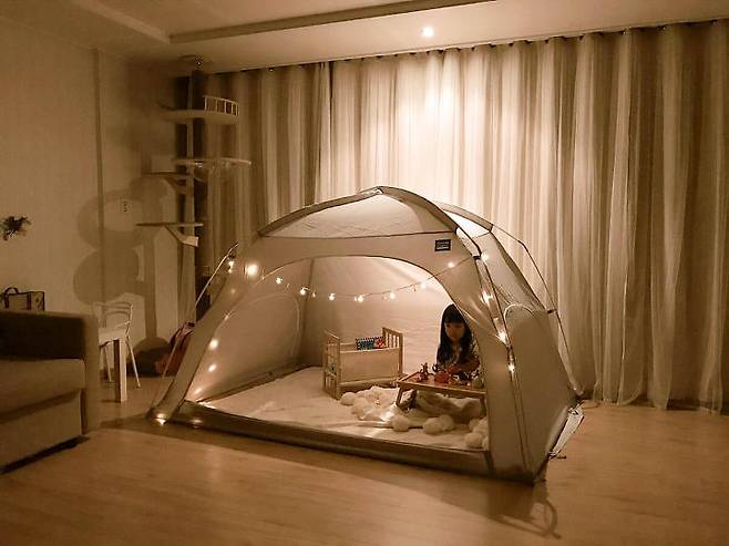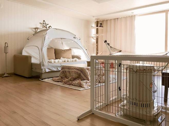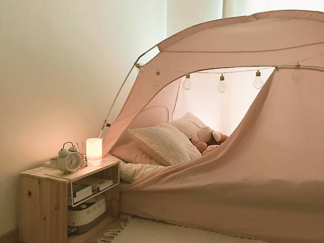 안방에도 난방텐트를 설치했어요. 거실과 차이점이라면 핑크색이란 점..? (다음 소파는 핑크색으로 바꾸려는 큰그림)