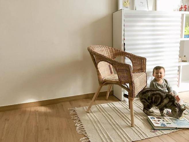소파와 캣폴 사이 남는 공간은 세살배기 아들을 위한 공간이에요. 누나에게 물려받은 책상과 의자 그리고 세살엉아의 살림살이들이 오밀조밀 모여있죠. 볕이 잘 드는 곳이라 아이와 놀기에 참 좋아요.