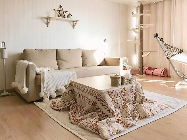 거실은 가족들의 주 공간인만큼 변화를 자주 주는 편이에요. 계절에 따라 난방텐트를 씌웠다 벗겼다~ 코타츠를 접었다 폈다~ 청소하면서 그때그때 바로 바꿔준답니다. 코타츠, 난방텐트 사용후기 정말 많이 물어보시는데요. 코타츠랑 난방텐트의 장점은 일단은 저처럼 도시가스가 들어오지 않는 지역에 사시는 분들이라면 난방비 절감에 톡톡히 한몫한다는 점!