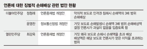 언론에 대한 징벌적 손해배상 관련 법안은 범여권을 중심으로 제출된 상황이다. 민주당에선 윤영찬 의원이 거짓 보도로 손해가 발생했을 경우 손해액의 3배 범위에서 손해배상액을 결정하는 정보통신망법 개정안을 발의했다. 특히 해당 보도에 대한 과실이 없음은 보도한 언론사가 규명하도록 했다.