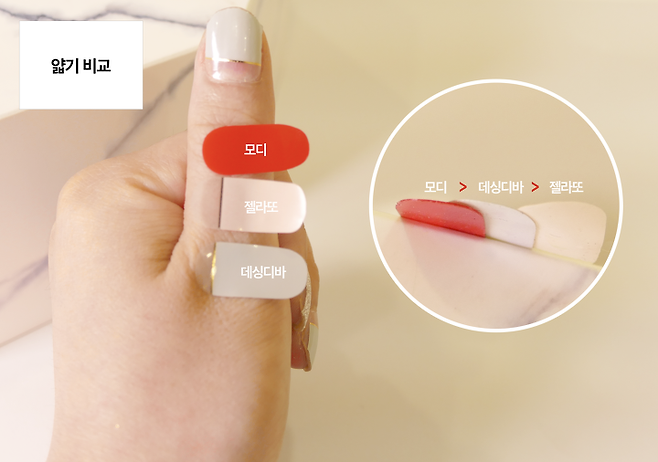 두께는 젤라또 > 데싱디바 > 모디 네일 순으로 얇았어요