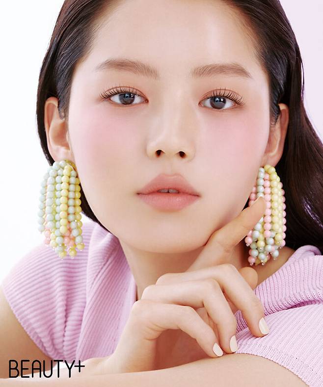 보송하게 마무리한 피부에 산뜻한 쿨 핑크와 달콤한 캔디 핑크로 구성된 버터리 치크 케이크 트윈 멜로우 스트로베리를 사용했다. 옅은 쿨 핑크를 아이홀 전체에 터치한 뒤 광대, 눈 밑 아래까지는 포인트 핑크를 넓게 펴 바르며 경계를 허물어 자연스레 이어질 수 있도록 마무리했다. 모든 제품은 스킨푸드.