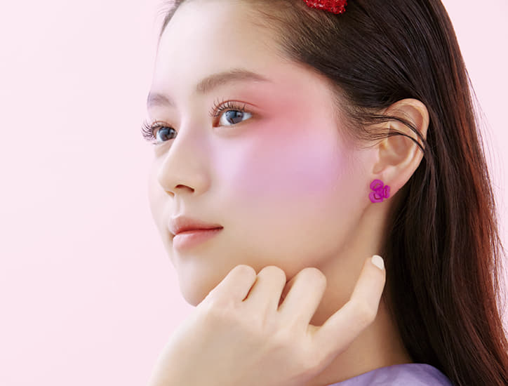 오묘한 보랏빛이 핑크색과 만나면 신비한 느낌이 배가된다. 버터리 치크 케이크 트윈 멜로우 스트로베리를 아이홀부터 C존까지 섬세하게 터치해 넓게 펴 발랐다. 그 뒤 맑은 페일 퍼플의 라벤더 크림 파이를 광대 정중앙부터 레이어드해 두 가지 컬러가 자연스레 이어질 수 있도록 그러데이션했다. 모든 제품은 스킨푸드.