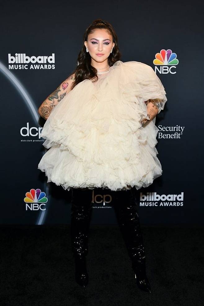 12. 싱어송 라이터 줄리아 마이클스(Julia Michaels)는 2020년 빌보드 뮤직 어워드에서 얇은 명주 그물을 입었다. 지안비토 로씨 부츠와 메시카 주얼리가 달린 Bicholla 드레스를 입었다.