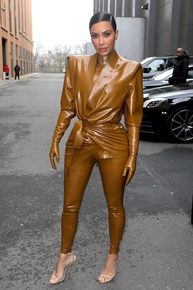 14. 킴 카다시안은 머리부터 발끝까지 카라멜 라텍스 복장으로 파리패션위크에 참석했다.