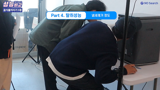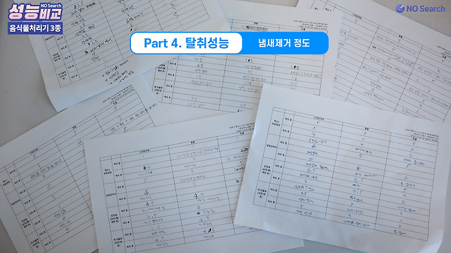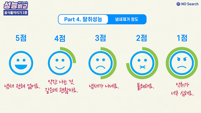 처리과정 중에 새어나오는 냄새, 처리 후 뚜껑을 열었을 때 나는 내부의 냄새 두가지로 테스트하였습니다.
