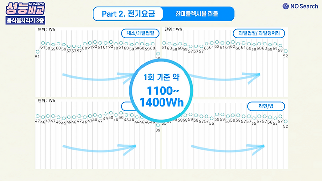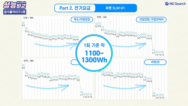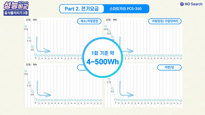 4가지 종류의 음식물 테스트에서 사용된 1회 전력소비량의 평균은 스마트카라가 가장 낮았습니다.