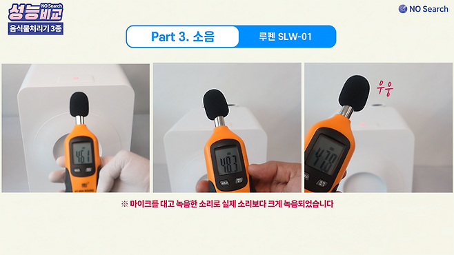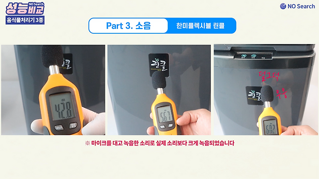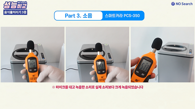 음식물 처리기의 소음은 크기와 종류가 일정하지 않고, 작동 과정과 시점에 따라 변하기 때문에 관찰하면서 소음의 종류가 바뀐다고 느껴질 때마다 측정하는 방식으로 촬영하였습니다.