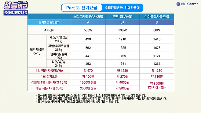 ③ 처리시간은 스마트카라(분쇄건조) < 루펜(건조), 린클(미생물방효) 순으로 짧으며, 전기요금도 비슷한 순서로 적게 나옵니다.